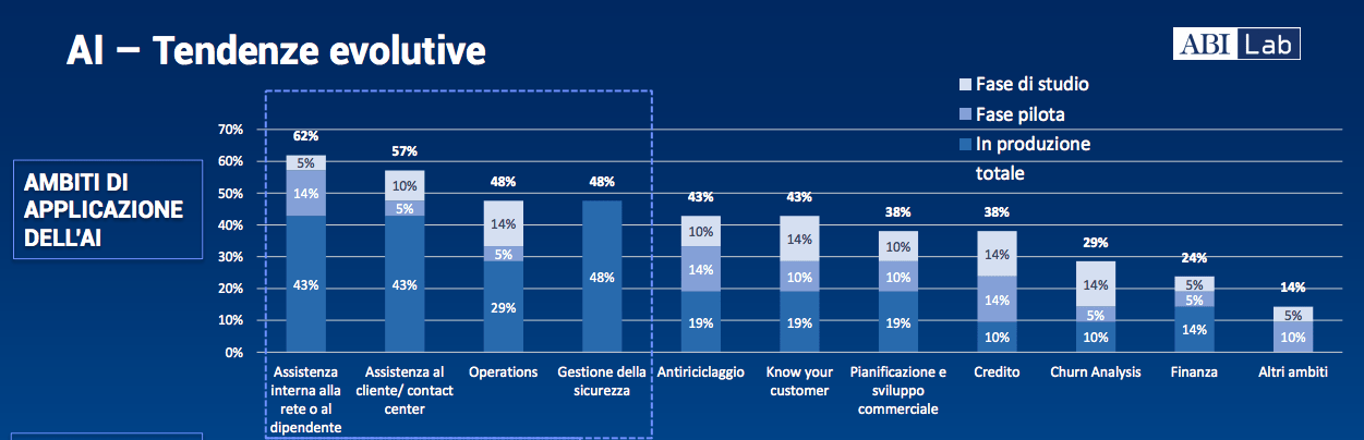 Secondo i dati del rapporto Abi Lab “Scenari e Trend del mercato ICT per il settore bancario”, Il 68% degli istituti di credito sta investendo in intelligenza artificiale.